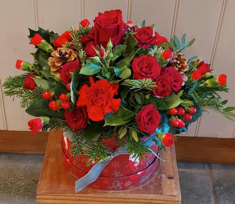 A Christmas hatbox filled with Christmas foliages and festive coloured flowers arranged in oasis. (flowers and hatbox design may vary to the photo)